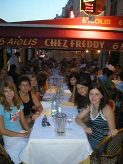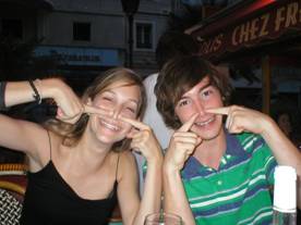 Vendredi soir ‚Chez Freddy’Après un matin à la plage et un après-midi à l’école nous sommes allés dans un restaurant. Il s’appelle ‘Chez Freddy’. Nous avions le choix de ce que nous voulons manger : une entrée, un plat principal et après un dessert, avec cela nous avons bu un verre de vin blanc. C’était agréable. À environ 11 heures nous avons passé la soirée dans un karaoké. Quelques un ont commandé un cocktail. Joachim avait 16 ans. Lundi nous avons célébré son anniversaire. Quelques personnes ont chanté « Somethin’ Stupid », « Mambo No.5 » et « Wannabe ». À la fin les garçons ont braillé la chanson « Feel » de Robbie Williams. Presque tout le monde a commencé à danser. Malheureusement nous avons dû quitter le bar à minuit. Après un petit combat avec des anglais et des français, nous sommes montés dans un taxi. À environ une heure nous sommes rentrés à la maison. Le dernier soir en France était vraiment super. Nous nous sommes bien amusés. |